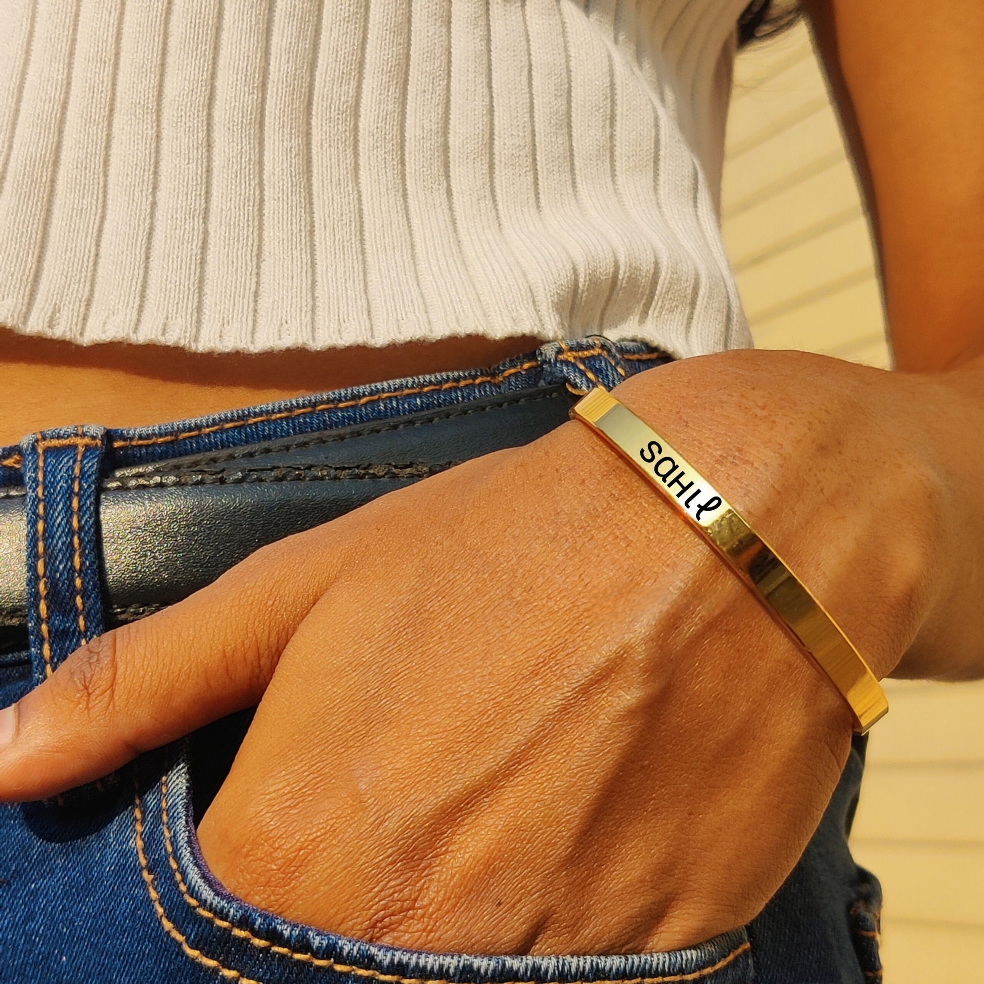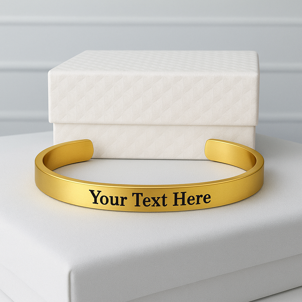 Elevate your style with this Name-Engraved Golden Kada, a perfect fusion of tradition, elegance, and personalization. Designed for both men and women, this golden-finish bracelet adds a luxurious touch to any outfit—whether it's everyday wear or a special celebration. With its refined look and custom engraving option, it’s more than an accessory—it’s a personal statement.