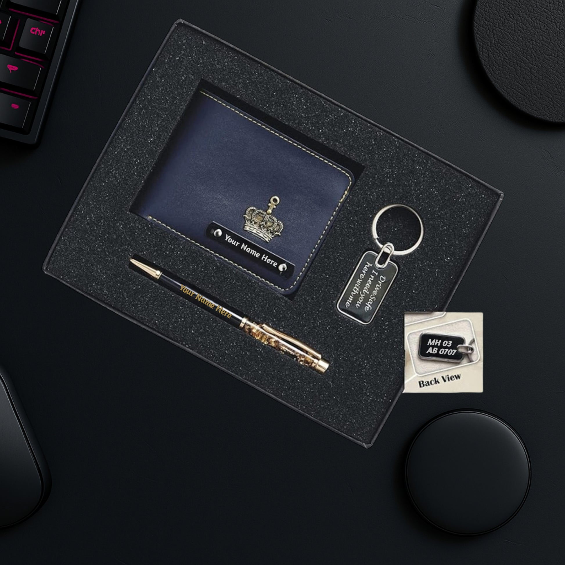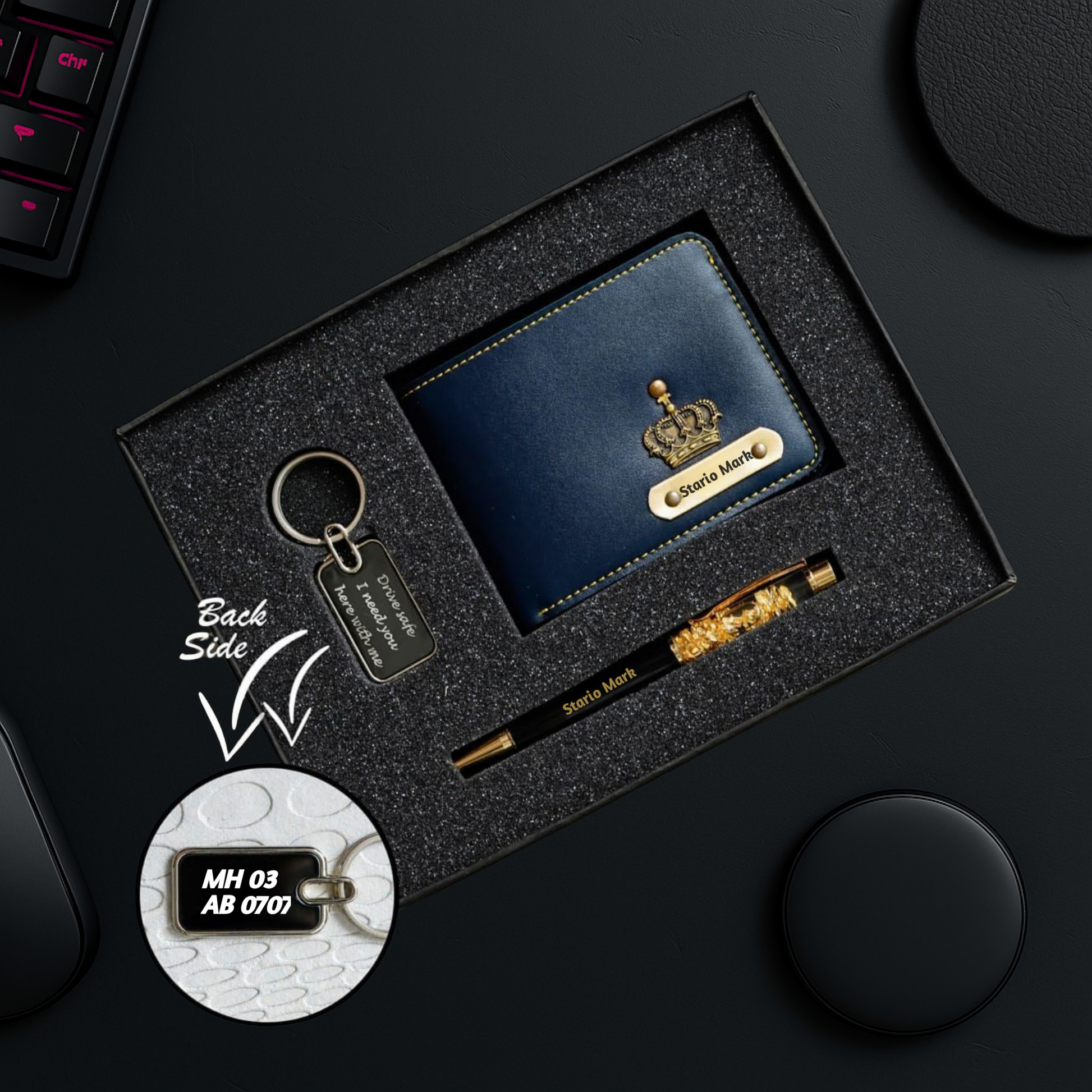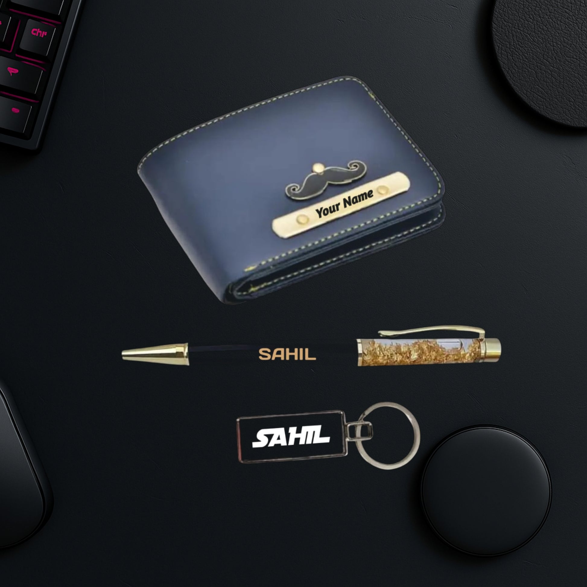 Personalized Premium Gift Set for Men – Includes Custom Name Wallet, Metal Pen & Keychain with Charm.