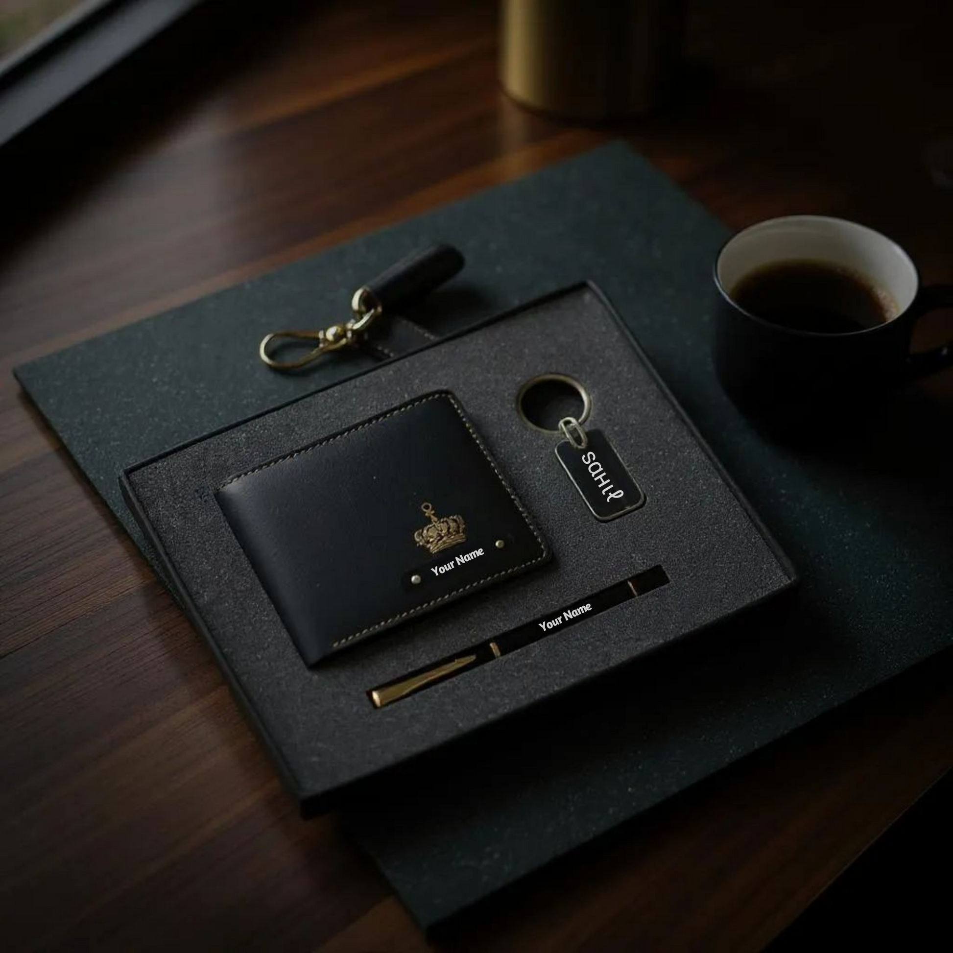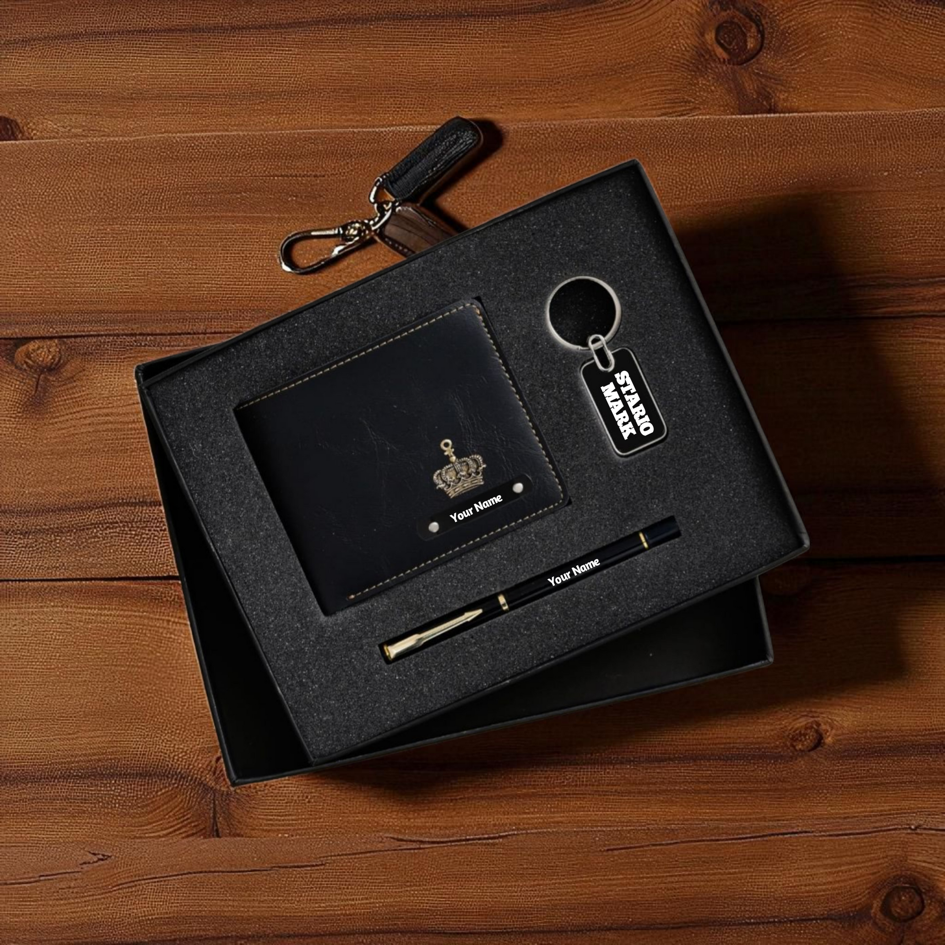 Personalized Premium Gift Set for Men – Includes Custom Name Wallet, Metal Pen & Keychain with Charm.