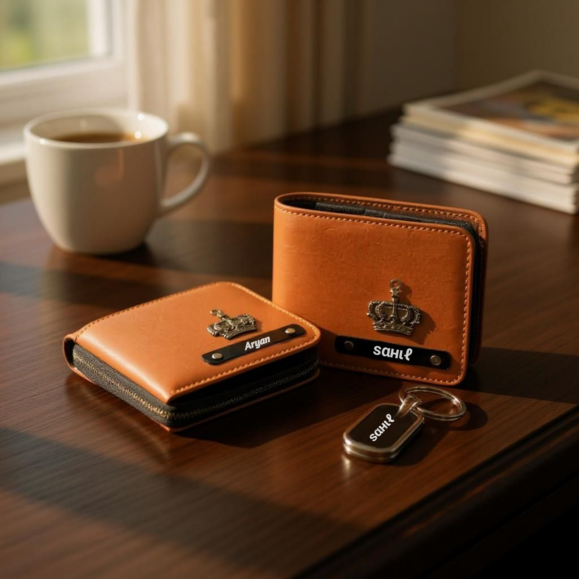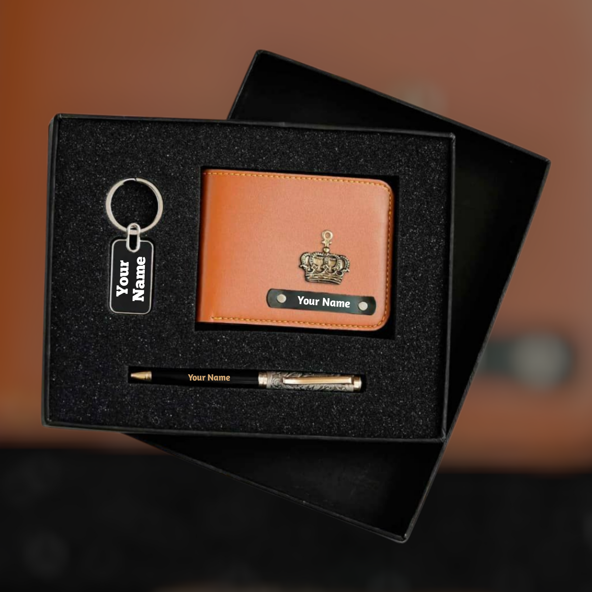 Personalized Premium Gift Set for Men – Includes Custom Name Wallet, Metal Pen & Keychain with Charm.